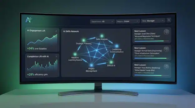 | Docebo | Enterprise-scale personalisation | AI recommendations and skills graph | Marketplace add-ons | Quote only (about $25–$35 per user per year) | 14-day trial |