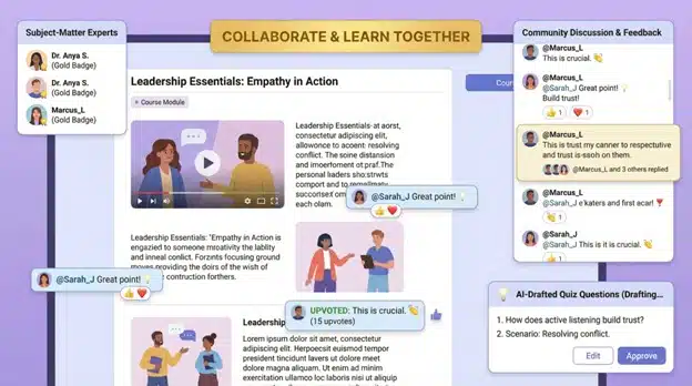 Constant improvement gets its strength with collaboration data. The learners vote helpful modules, report confusing ones and tag their colleagues to assist them. Those social indicators feed the dashboards indicating what leadership skills get as well as what the lessons require relesoning. As per G2, the platform has an average rating of 4.6 out of 5 related to 543 reviews, where users have complimented the platform on its community feel and speed of course creation.