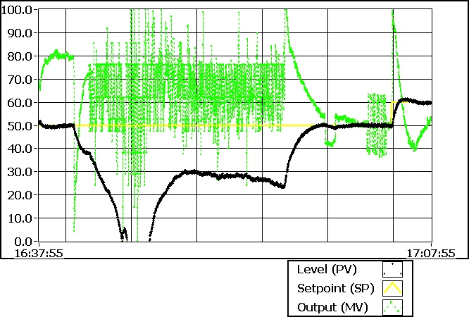 To get the tank’s level close to that set value, a larger% change to the control valve had to be made as the level sensor was not very sensitive.